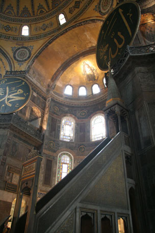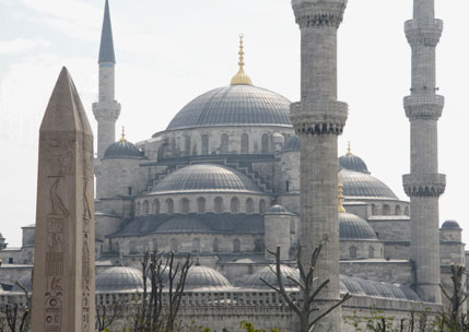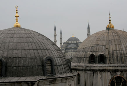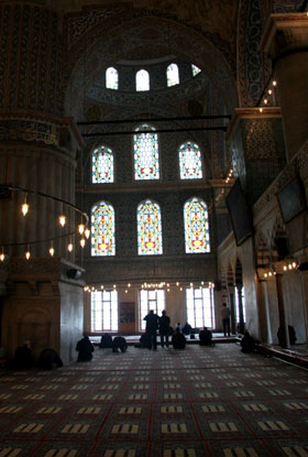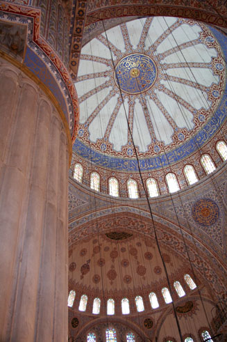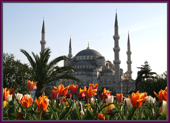 then mosque, now museum is a huge structure with amazing architecture, paintings, mosaics, and many other surprises (shown above). The other large mosques were also amazing, especially the Blue Mosque (left) with the interior entirely covered in blue and white painted tiles. One of the first things that is noticed when traveling in Turkey is the call to prayer that is sung 5 times a day projected across every city from microphones on the minarets of the mosques. A wonderful reality check that you are somewhere different – sometimes it was not so clear with many people speaking English, American fast food restaurants on street corners, and most people wearing Western clothing. The best though was reading a book in the park between the Aya Sofya and Blue Mosque and hearing what is best described as a dueling banjo like rendition of the call to prayer as the two mosques were projecting the call out to the city at staggered intervals. Interestingly, I also learned that tulips are native to central Turkey. |