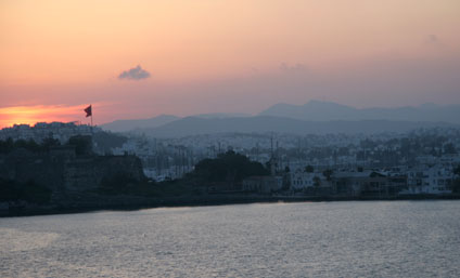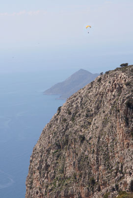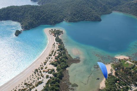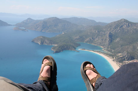 for a while checking out the market, enjoying the harbor, playing many games of backgammon, smoking a nargile or water pipe, and catching some soccer games at the bar with fellow travelers Kate and Malena. The best though was paragliding. I was driven up to the top of a mountain, strapped into the rig with the pilot, we took a couple steps down hill and like that we were off and flying! It was very relaxing and quiet as we soared down off the mountain past some cliffs then over the sea. It was a little over 30 minutes of air time and before us stretched a sparkling sea speckled with forested islands and a perfect beach on the edge of the city Ölüdeniz. After landing on the beach I chilled there soaking up the sun while replaying the fight over a few times in my mind. |