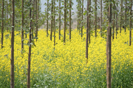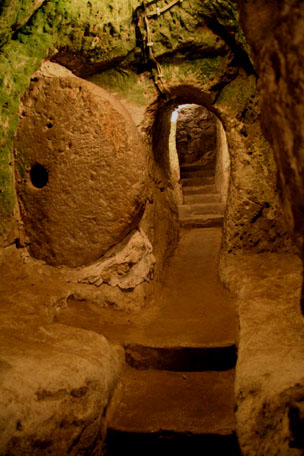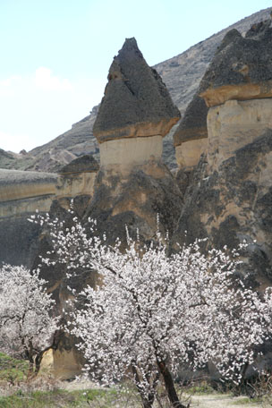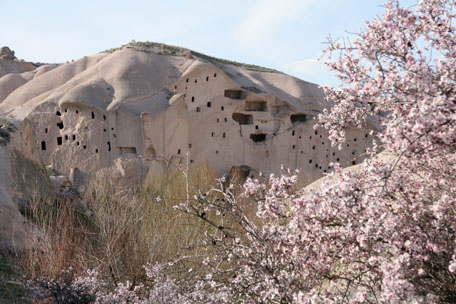rock – tables, pits lined with terracotta for cooking, bins to store food and water for livestock, wine making pits, and churches with vibrant frescoes. Massive circular stones would be rolled into place blocking entrances when necessary and every cliff wall was riddled with pigeon houses like Swiss cheese. The pigeons were used to transport messages and provided fertilizer for the crops. The land defied its deceptive barren look with blooming apricot trees, budding grape vines, and fields of crops wherever I looked.