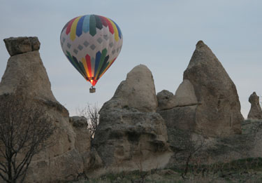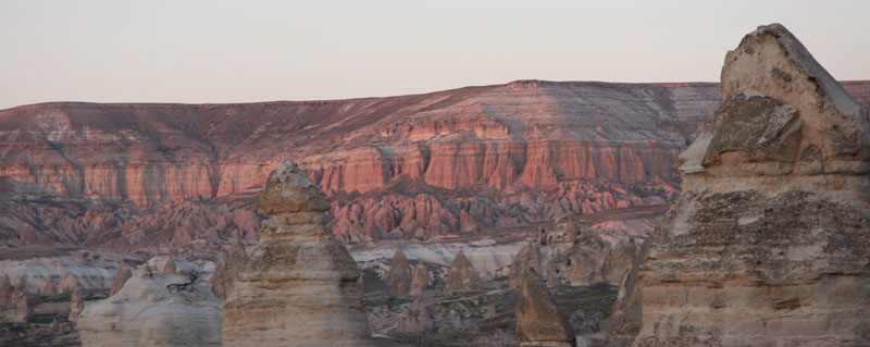 over the wild landscape in a hot air balloon at dawn. The rosy light spilled over the wonderfully strange eroded shapes that were scattered across the land and revealed the wide extent that was once inhabited underground by the myriad of cave entrances now dark and empty. |