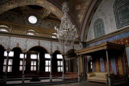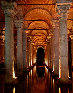than the marble artifacts packed in to most museums I paid the Museum for Turkish and Islamic Arts a visit. It had a great variety of intricate wood carvings, calligraphy artifacts, carpets, and porcelain. The Tokapi Palace, once the stomping grounds of the sultans, now also contains many interesting artifacts. The palace itself is neat to walk through with many grassy courts, views of the water, sitting rooms, and of course the plush harem or “private” area. Another neat corner in Istanbul is the Basilica Cistern, a huge eerily lit water storage area beneath the city. |