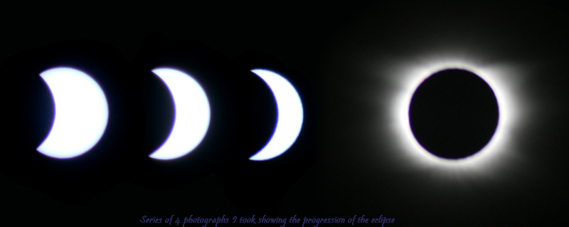 The natural phenomenon was stunning, powerful, and awe inspiring - an experience wilder than dreams and more exciting than Hollywood special effects. Time stood still during totality, which lasted for three and a half minutes and the partial phase was about an hour on either side. As the eclipse progressed the light steadily got dimmer and the temperature dropped (in total probably 10 – 15 degrees!) until we saw the shadow of the moon crossing the mountains then the plains before us and then we were in it, but for a little while the nearby clouds were not – they were partially lit while the rest of the land was dark. As a beautiful 360 degree sunset/rise encompassed us the land fell silent. Below is what is called the diamond ring stage just as the moon is moving out from infront of the sun.