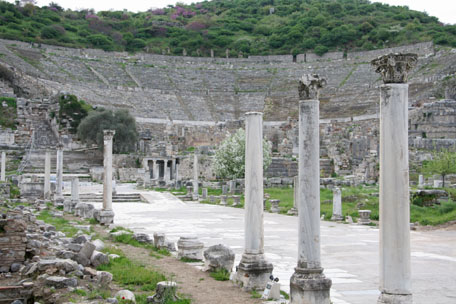 From this town it was a quick hop over the amazing ruins of Ephesus. Complete with large and small theaters, a library (my favorite – the tall building with statues and columns), a 50 m long street mosaic, temples, fountains, living quarters, streets, underground sewer, hot and cold water lines, bathrooms, brothels, trade centers, gymnasium, baths, and tombs, I see why it is regarded as the one of the best surviving examples of a classical Roman city. |