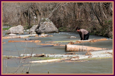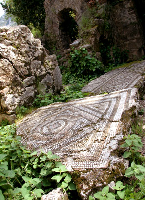 Tucked away in a deep wooded valley below snow capped mountains, it was a great place to getaway from the bustle of life and relax. A short stroll from the cabins and tree houses down the river brings you to a nice beach. On the way we took a side trail and explored some overgrown ruins deep in a swampy forest. We were led to some interesting sights, the best being some impressive mosaics and an amazing view of the valley, river, and ocean from on top of a ridge. |