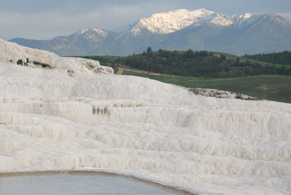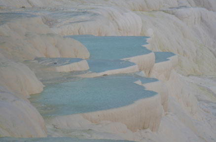 the home of the famed ridge covered with calcium deposits and travertine pools. Exploring the surrounding area with a fellow traveler, Ingrid, we were very surprised at the extent of it. The white pillow looking flows covered a huge area. Unfortunately the thousands of years of people walking on the formations and bathing in the pools has taken a toll on the pristine beauty. But with recent limited barefoot access and directed water flow a fresh coat of calcium should rejuvenate the area. After trying to catch the sunset reflecting in the pools (unfortunately mostly thwarted by clouds) we had an exciting experience of hiking by brail – walking barefoot down the wet calcium covered hill with the sun down and the lights taking their time to turn on. |